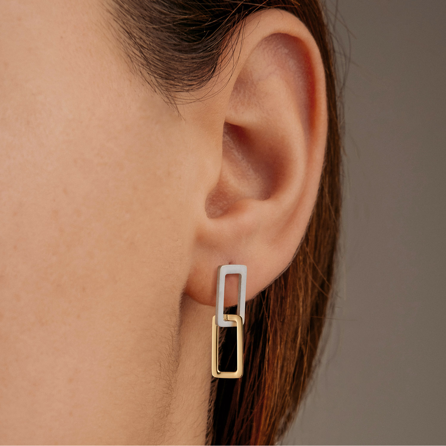 Laat je stijl spreken met deze elegante mat/ glanzende bicolor titanium oorstekers, ontworpen met verfijnde rechthoekige vormen. Het strakke, minimalistische ontwerp geeft een moderne en zelfverzekerde uitstraling die moeiteloos past bij elke look. Lengte 2cm. Combineer deze oorbellen met de bijpassende sieraden voor een complete look.