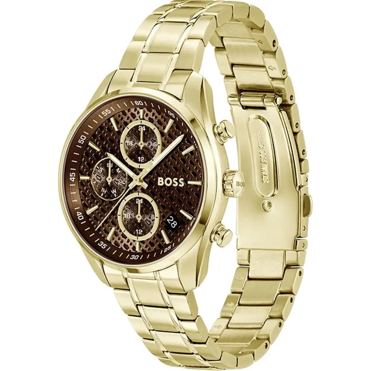 Dit BOSS horloge uit de GRAND TOUR LADIES serie met artikelnr: HB1502770 heeft een luxe sportieve uitstraling. Zeer geschikt voor de moderne stijlvolle vrouw van nu. Het dameshorloge valt op door zijn stalen goudkleurige horlogekast met een gladde goudkleurige bezel en een bruine sunray wijzerplaat met een dag, datum en 24-uursaanduiding. Opvallend zijn de fijne wijzers. Aan de kast zit een stalen mat glanzende goudkleurige schakelband met een vouwsluiting. Het horloge heeft een doorsnee van 38mm met een mineraalglas en is 3ATM.
