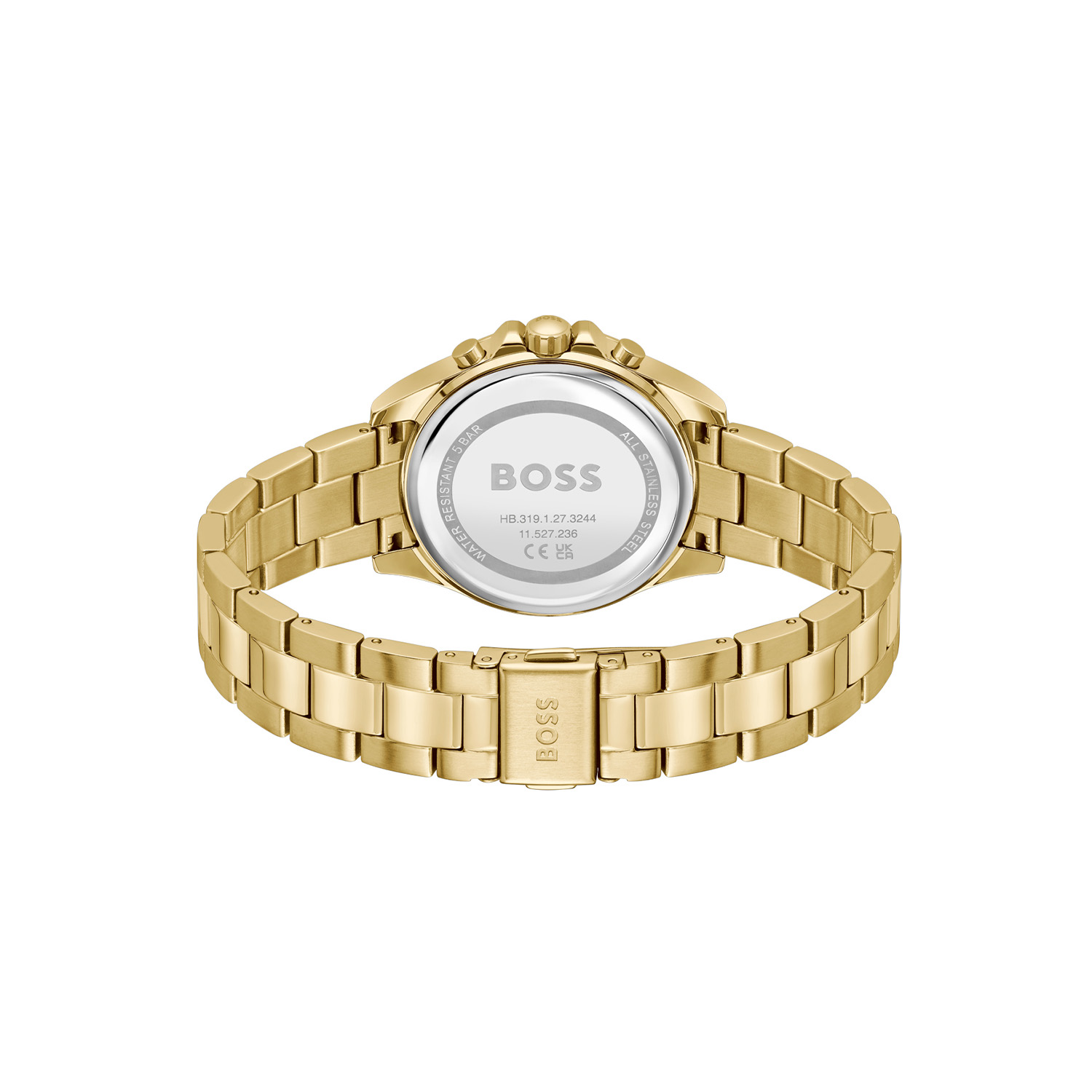 Dit BOSS horloge uit de ALLEY serie met artikelnr: HB1502829 heeft een sportieve uitstraling. Geleend van de jongens is dit horloge meer dan alleen een tijdmeter; het legt de essentie vast van mannelijke elegantie met vrouwelijke charme. ALLEY is een dagelijkse bevestiging van je toewijding om te leiden, te innoveren en te veroveren. Het gaat niet alleen om de tijd bijhouden, maar ook om elk moment te grijpen en er je eigen draai aan te geven. Dit dameshorloge valt op door zijn stalen goudkleurige horlogekast met een goudkleurige bezel en een zilverwitte sunray wijzerplaat met een dag, datum en 24-uursaanduiding. De uren worden aangeduidt met kristallen. Aan de kast zit een goudkleurige schakelband met een vouwsluiting. Het horloge heeft een doorsnee van 36mm met een mineraalglas en is 5ATM.