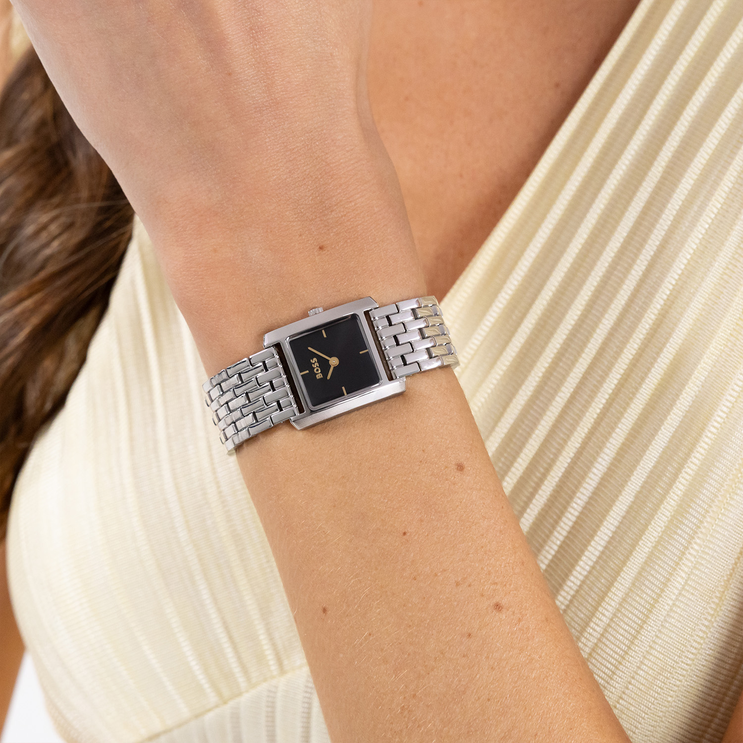 Dit BOSS horloge uit de LUCY SCALA serie met artikelnr: HB1502844 heeft een chique uitstraling. Het gaat niet alleen om de tijd, maar ook om elk moment te grijpen en er je eigen draai aan te geven. Wees je eigen baas, bepaal je eigen tempo en ga ervoor. Dit dameshorloge valt op door de stalen vierkante horlogekast met een zwarte sunray wijzerplaat met fijne wijzers. Aan de kast zit een stalen schakelband met een vouwsluiting. Het horloge heeft een doorsnee van 26,5mm, een mineraalglas en is 3ATM.