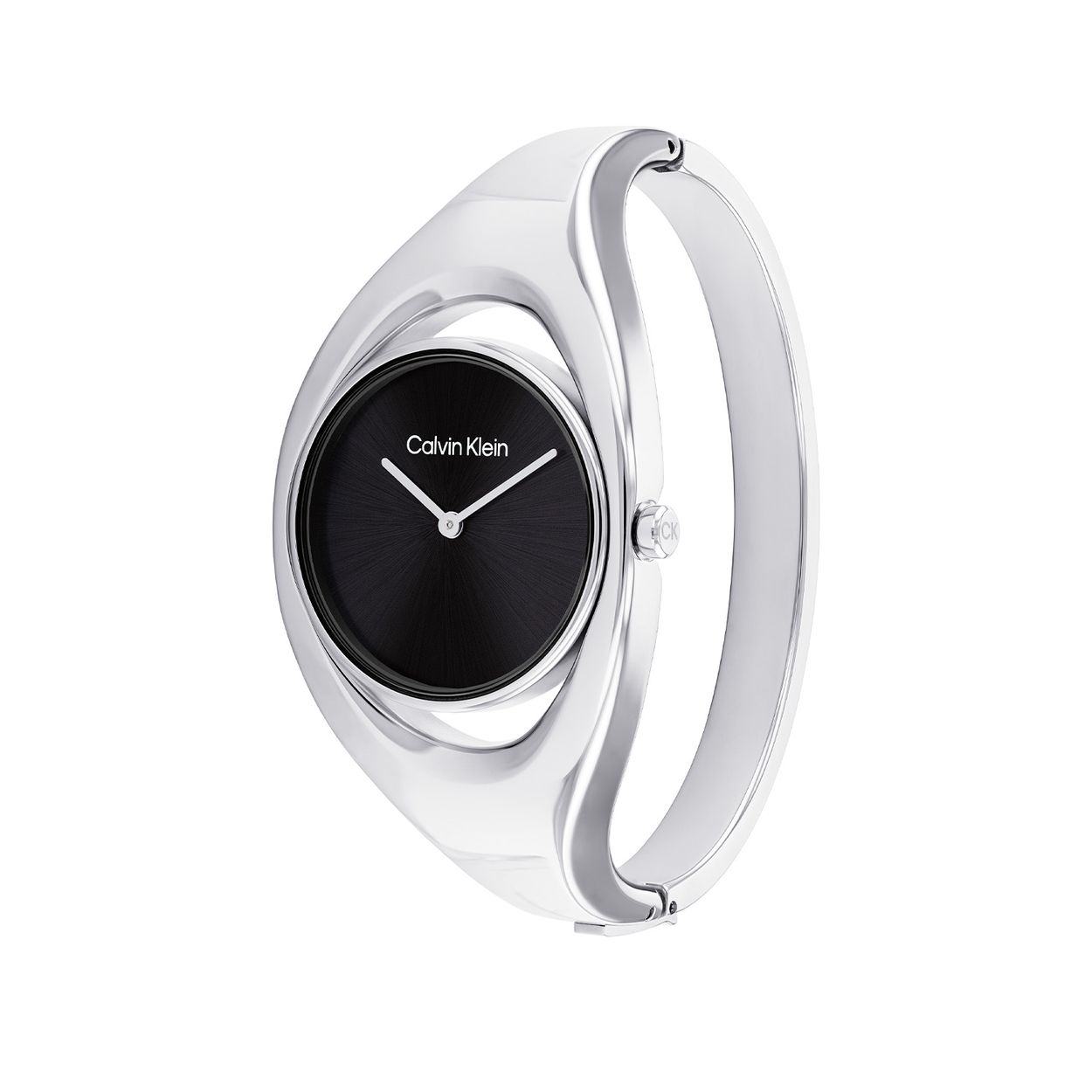 Dit Calvin Klein dameshorloge met nr CK25200423 is een chique ontwerp. De stijlvolle zilverkleurige ronde stalen kast heeft een opening in de rand, dit geeft het klokje een zwevend effect in de band. Op de zwarte sunray wijzerplaat zijn de fijne wijzers mooi zichtbaar en staat de naam Calvin Klein afgedrukt. Het bezondere aan dit model is een doorlopende zilverkleurige bangle band. Het sierlijke horloge heeft een mineraalglas, een doorsnee van 30mm en is 3 ATM.