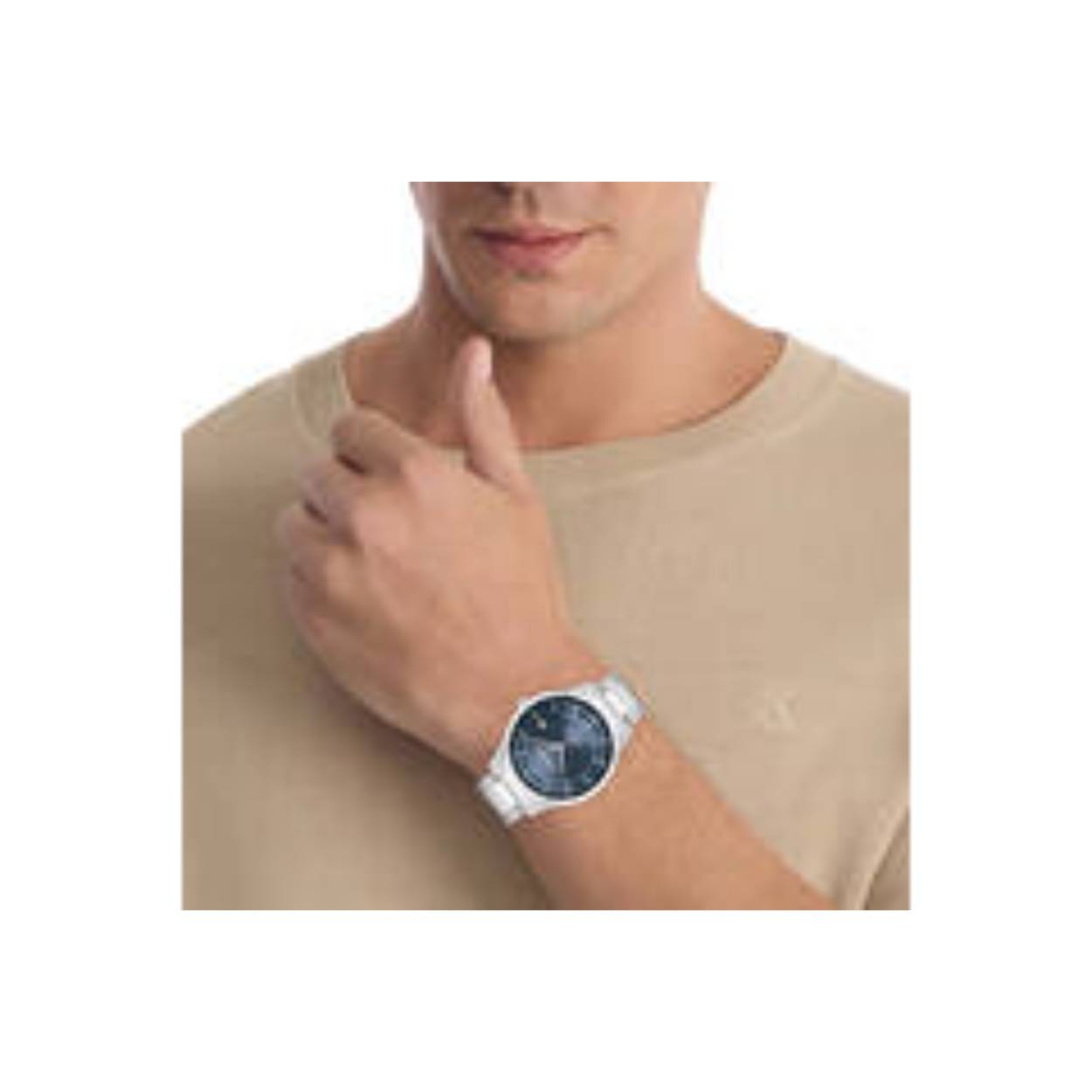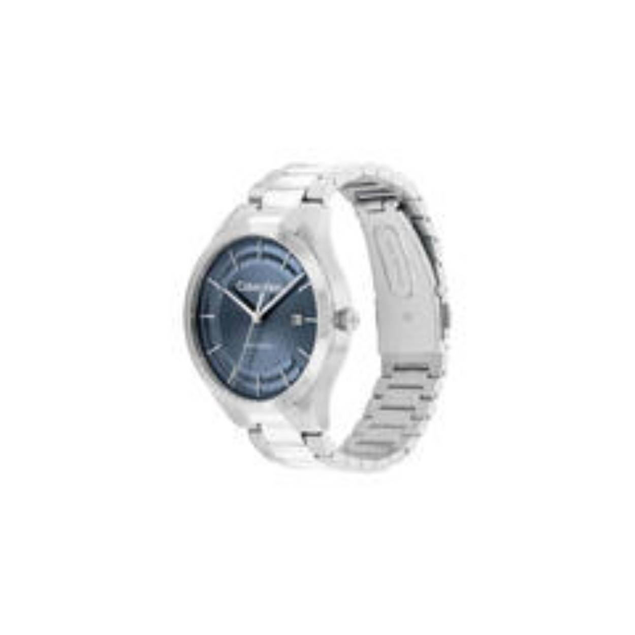 Dit Calvin Klein herenhorloge met nr CK25300020 is een klassiek ontwerp. De stijlvolle zilverkleurige ronde stalen kast heeft een gladde rand met een half geschuurde blauwe wijzerplaat met een uitgespaarde C, een datum en een automatisch uurwerk. Het loopt dus op de beweging van de pols. Door een glazen onderkant is het uurwerk zichtbaar. De fijne wijzers een streepjes tonen heel chique. Aan de kast zit een zilverkleurige stalen mat glanzende schakelband met vouwsluiting. Het herenhorloge heeft een mineraalglas, een doorsnee van 40mm en is 3ATM.
