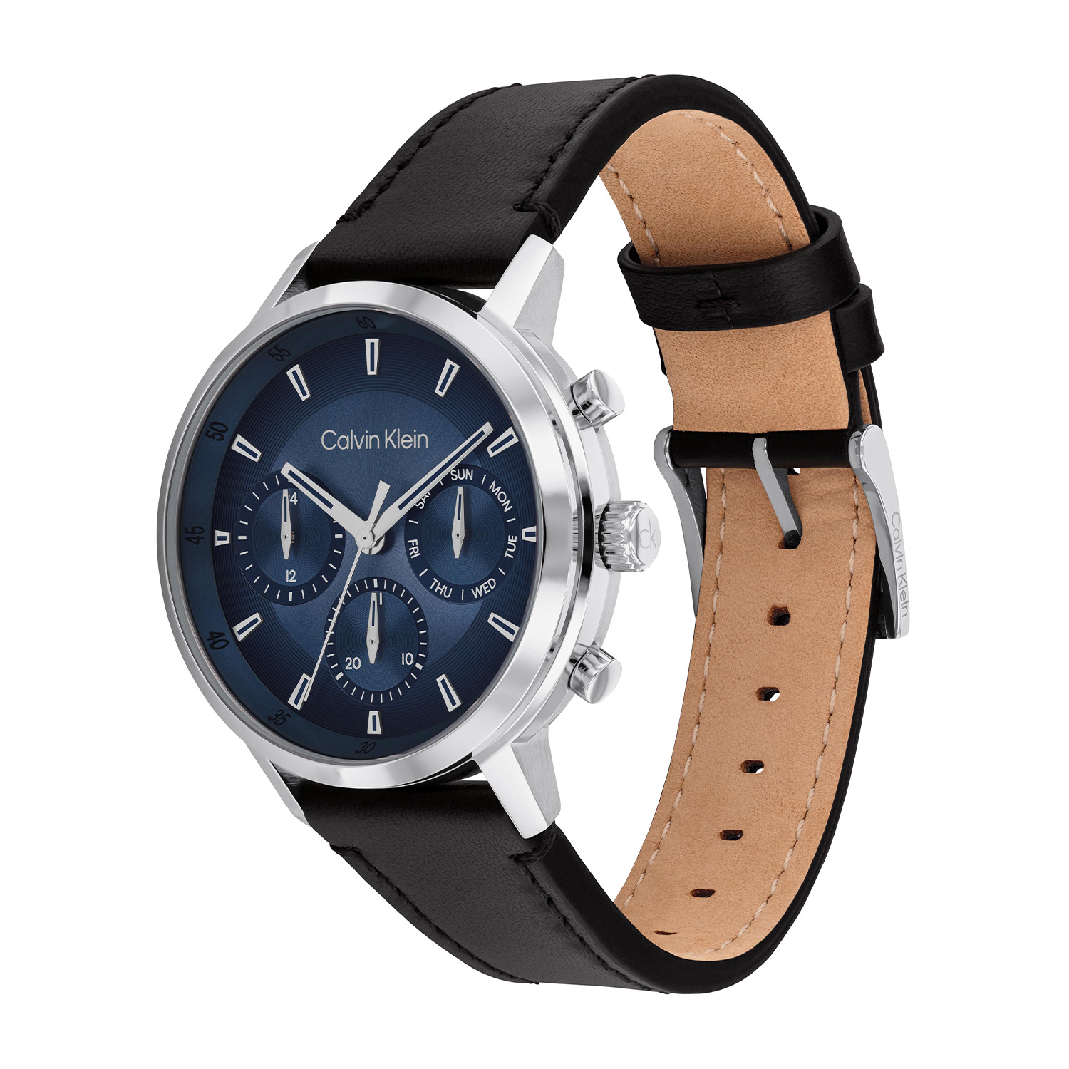 Dit Calvin Klein herenhorloge met nr CK25200497 is een stijlvol ontwerp. De ronde stalen kast heeft een glimmende bezel en een blauwe geborstelde sunray wijzerplaat met een dag, datum en 24-uursaanduiding. Aan de kast zit een zwarte lerenband met een gespsluiting. Het herenhorloge heeft een mineraalglas, een doorsnee van 41mm en is 3ATM.