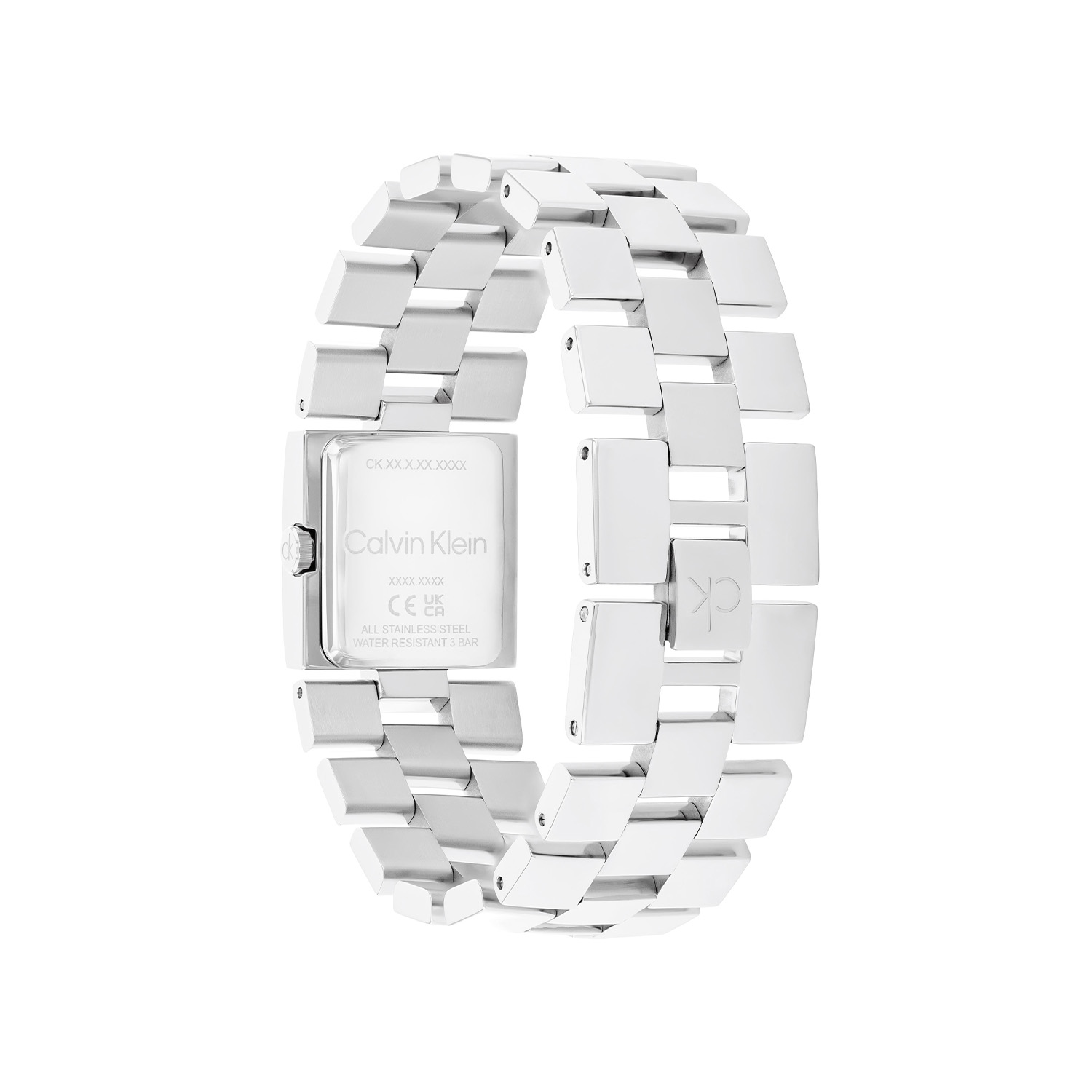 Dit Calvin Klein dameshorloge met nr CK25100088 is een opvallend ontwerp. De strakke vierkante stalen kast heeft een zilverkleurige sunray wijzerplaat met fijne zilverkleurige wijzers en het logo. Strak aan het kastje zit een brede vierkante schakelband met een druksluiting. Het elegante dameshorloge heeft een mineraalglas, een afmeting van 22mm en is 3ATM.