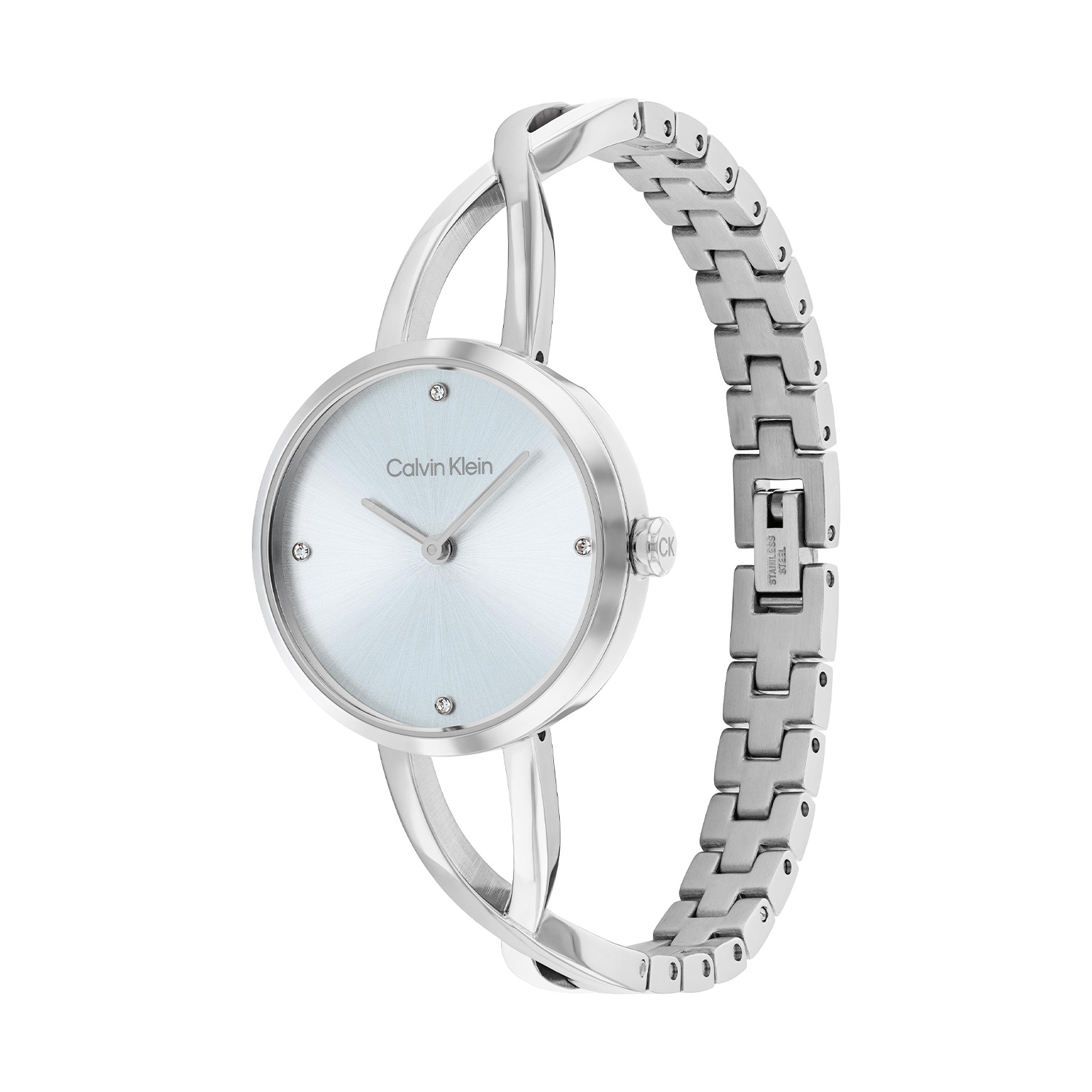 Dit Calvin Klein dameshorloge met nr CK25100058 is een klassiek ontwerp. De stijlvolle ronde stalen kast heeft een gladde bezel, een blauwe sunray wijzerplaat met fijne wijzers en op de 3,6,9 en 12 heeft het een kristal als uursaanduiding. Strak aan de kast zit een stalen fijne bangle band die uitloopt in schakels en daar te verstellen is op maat. Het elegante dameshorloge heeft een mineraalglas, een doorsnee van 28mm en is 3ATM.