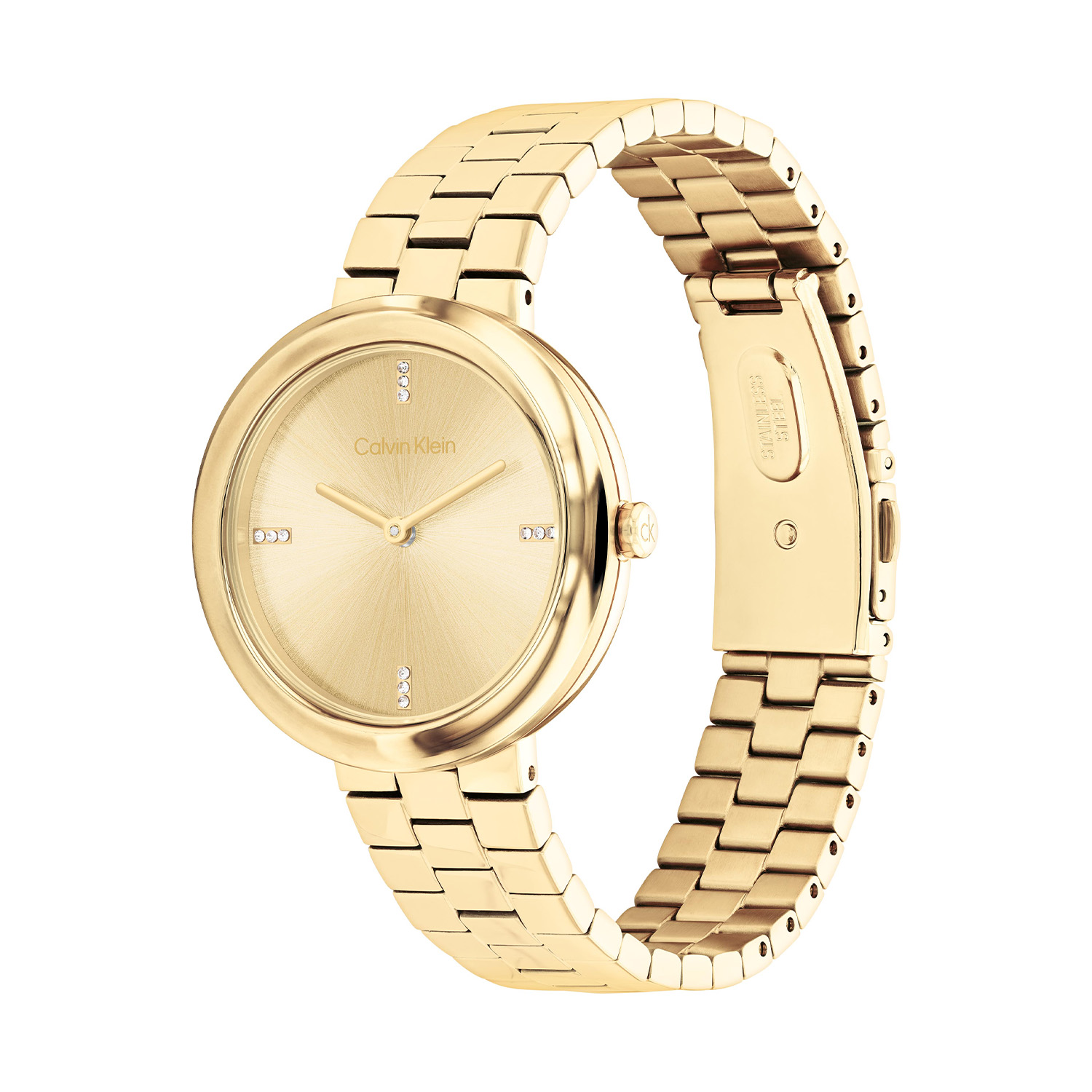 Dit Calvin Klein dameshorloge met nr CK25100094 is een tijdloos ontwerp. De stijlvolle ronde goudkleurige stalen kast heeft een gladde gedraaide bezel en een goudkleurige sunray wijzerplaat met fijne wijzers en kristallen op de 3,6,9 en de 12. Strak aan de kast zit een stalen glanzende goudkleurige schakelband met een vouwsluiting. Het elegante dameshorloge heeft een mineraalglas, een doorsnee van 34mm en is 3ATM.