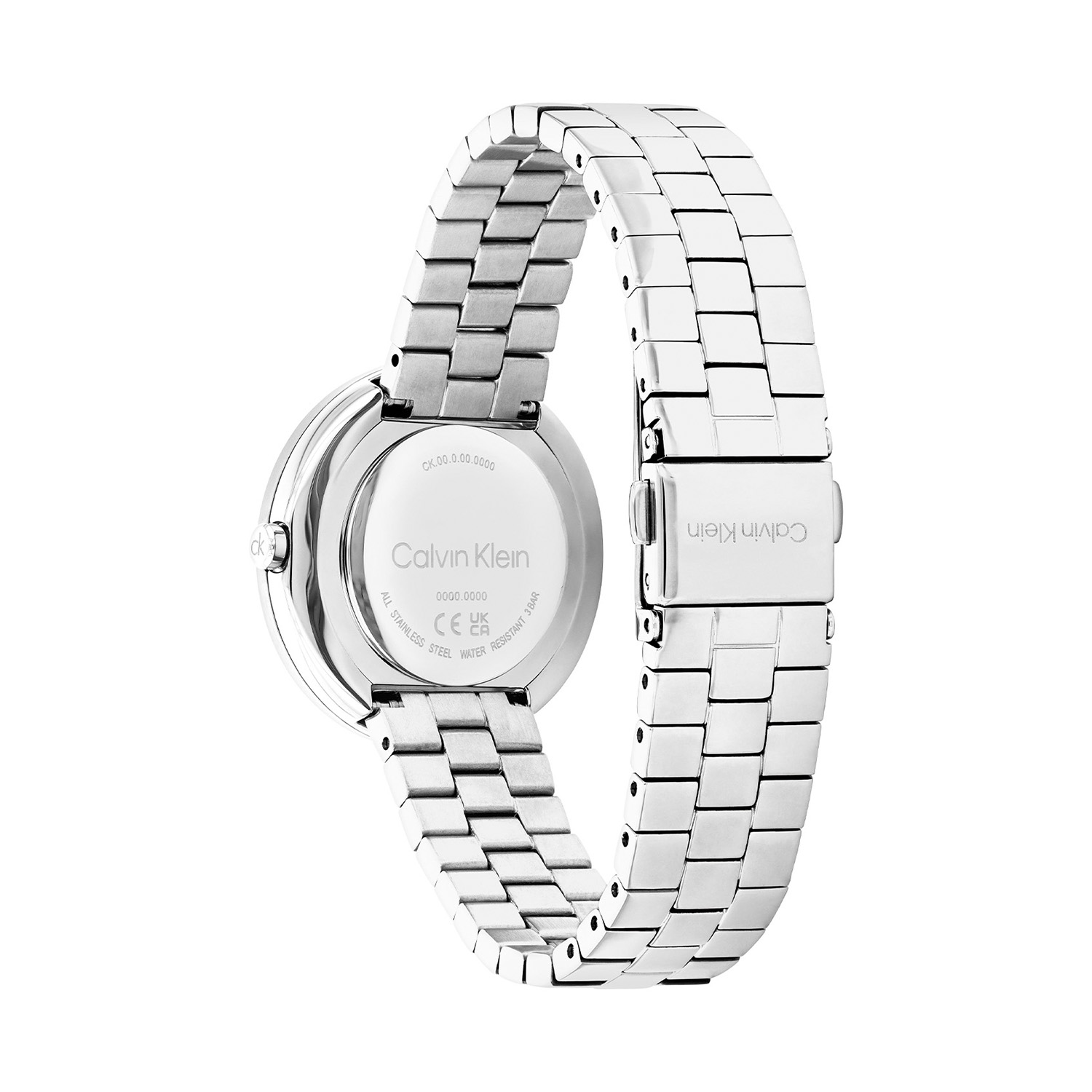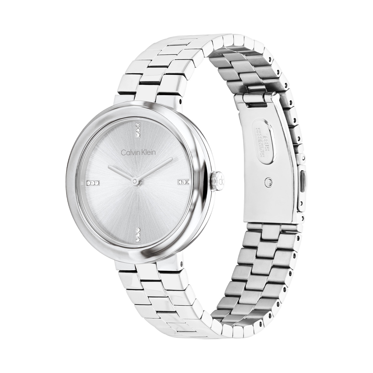 Dit Calvin Klein dameshorloge met nr CK25100093 is een tijdloos ontwerp. De stijlvolle ronde stalen kast heeft een gladde gedraaide bezel en een zilverkleurige sunray wijzerplaat met fijne wijzers en kristallen op de 3,6,9 en de 12. Strak aan de kast zit een stalen glanzende schakelband met een vouwsluiting. Het elegante dameshorloge heeft een mineraalglas, een doorsnee van 34mm en is 3ATM.
