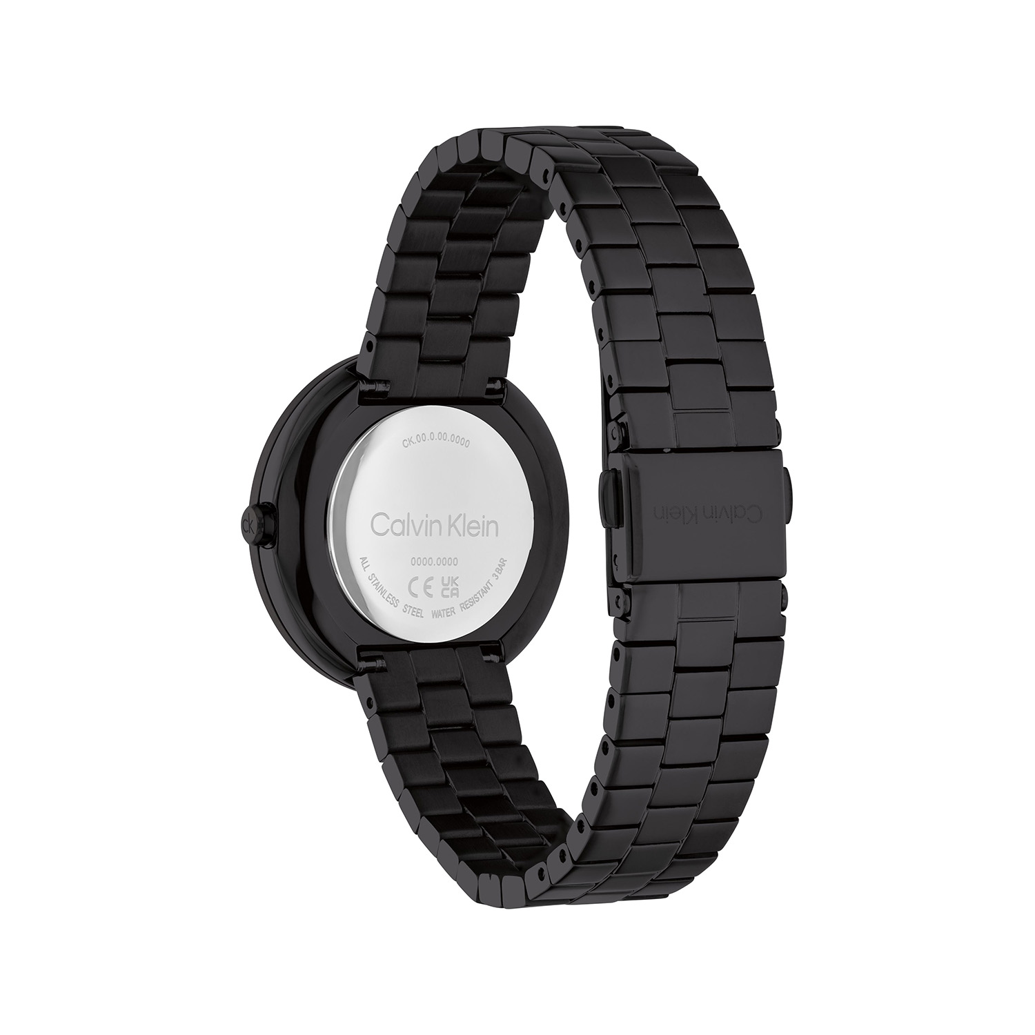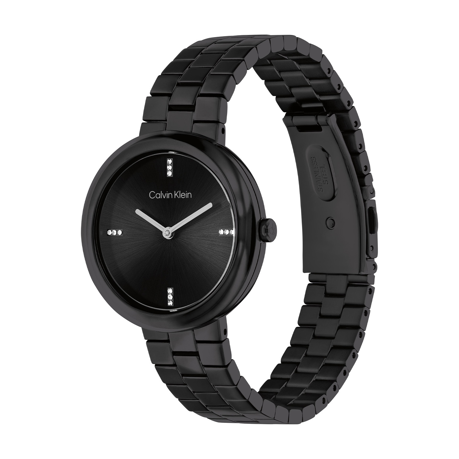 Dit Calvin Klein dameshorloge met nr CK25100096 is een tijdloos ontwerp. De stijlvolle ronde zwarte stalen kast heeft een gladde gedraaide bezel en een zwarte sunray wijzerplaat met fijne wijzers en kristallen op de 3,6,9 en de 12. Strak aan de kast zit een stalen glanzende zwarte schakelband met een vouwsluiting. Het elegante dameshorloge heeft een mineraalglas, een doorsnee van 34mm en is 3ATM.