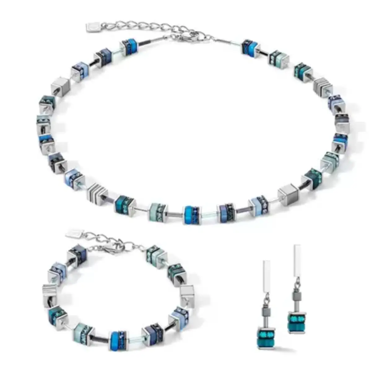 Roestvrijstalen armband Blue uit de GeoCUBE collectie van Coeur de Lion, handgeregen in Duitsland, nieuw in geschenkverpakking. De armband is geregen met blokjes in verschillende tinten blauw, met kristallen en strassrondellen en zilverkleurige roestvrijstalen vierkante schijfjes. De armband heeft en draaglengte van 18 tot en met 21 cm, ook geschikt voor een wat bredere pols. Dikte van de blokjes is 0,8 cm.