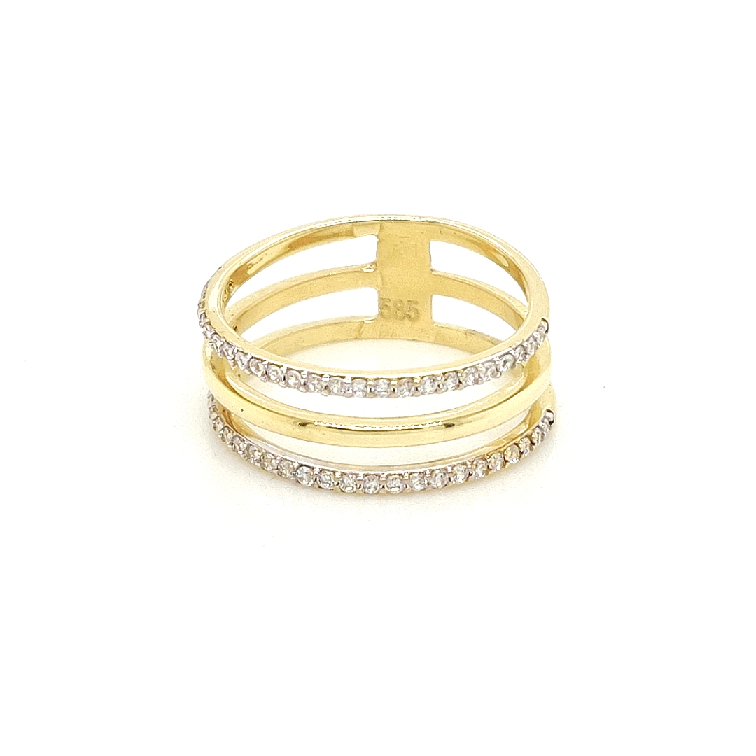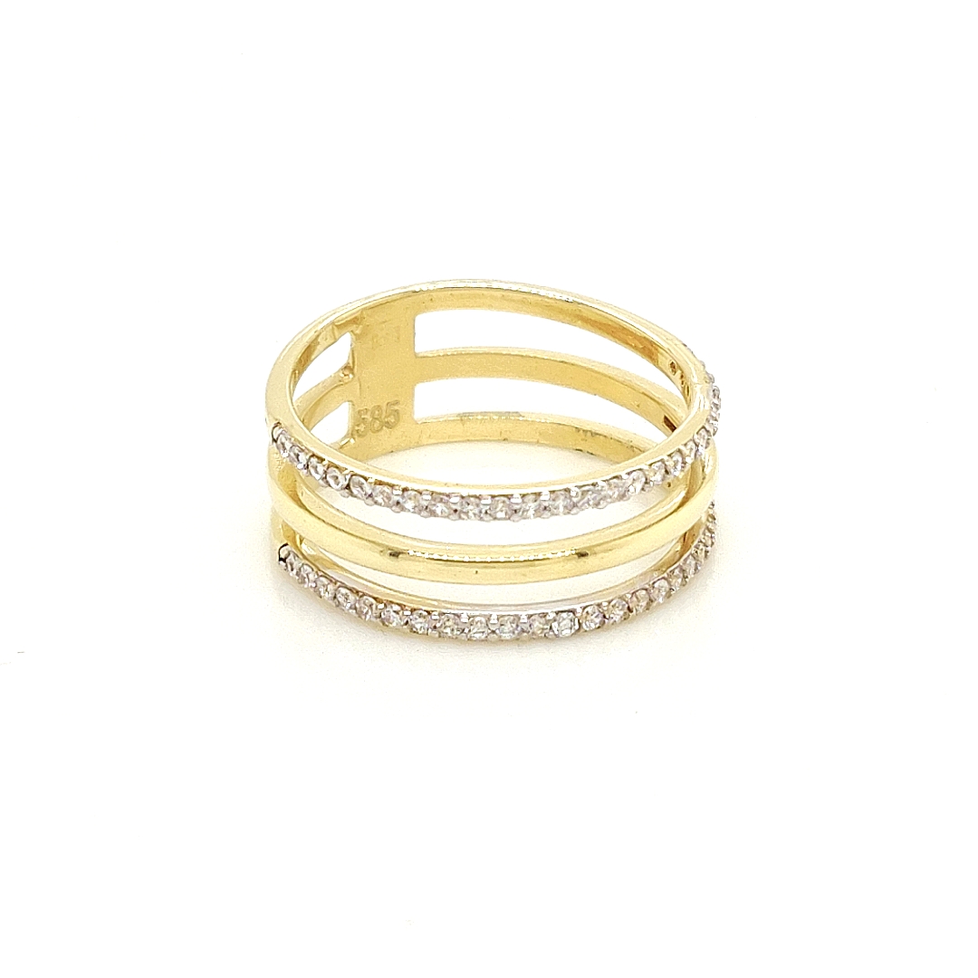 Deze geel gouden ring is ontzettend sierlijk. De ring bestaat uit drie rijen van geelgoud waarbij de twee buitenste rijen zijn volgezet met briljant geslepen zirkonia stenen. De middelste rij is glad gepolijst.