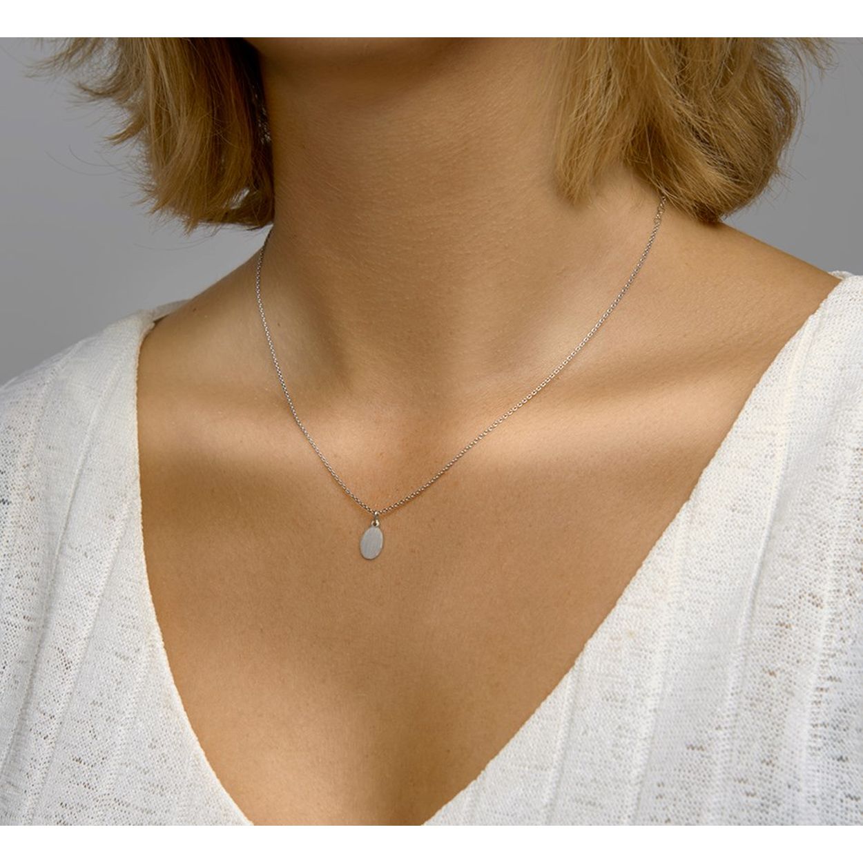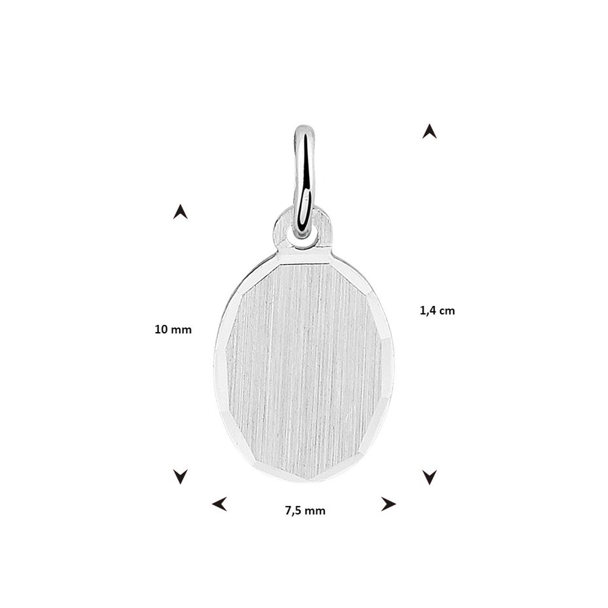 Gerhodineerd 925 zilveren ovale graveerhanger met een mat/gediamanteerde afwerking. De hanger heeft een totale hoogte van 1.4cm en een breedte van 7.5mm.