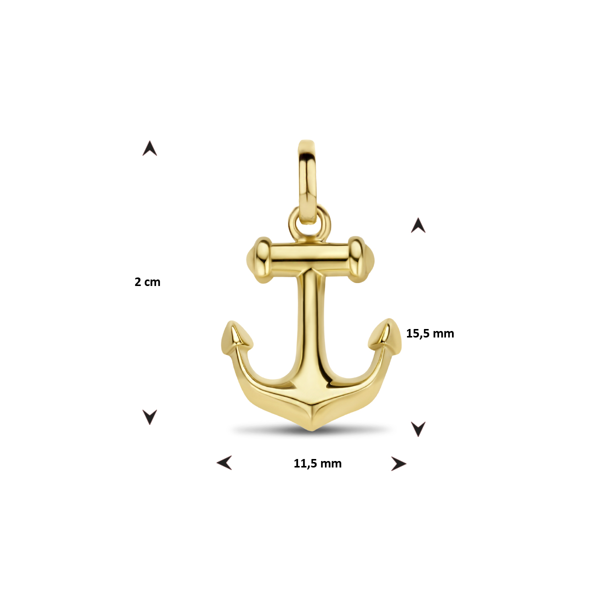 Geelgoud 925 zilveren hanger in de vorm van een anker. Het anker heeft een afmeting van 15.5x11.5mm. Geen garantie op plating.