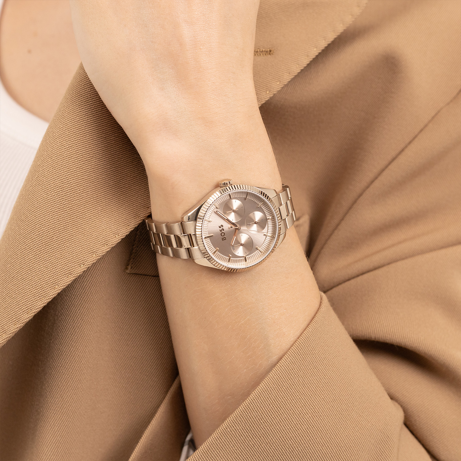 Dit BOSS horloge uit de SAGE SPORT serie met artikelnr: HB1502801 heeft een luxe uitstraling. Zeer geschikt voor de moderne stijlvolle vrouw van nu. Het dameshorloge valt op door zijn stalen beige horlogekast met een gekartelde bezel en een beige sunray wijzerplaat met een dag,- datum,- en 24-uursaanduiding. De wijzers en uurstrepen zijn fijn gefaceteerd. Aan de kast zit een stalen beige schakelband met een vouwsluiting. Het horloge heeft een doorsnee van 34mm een mineraalglas en is 3ATM.