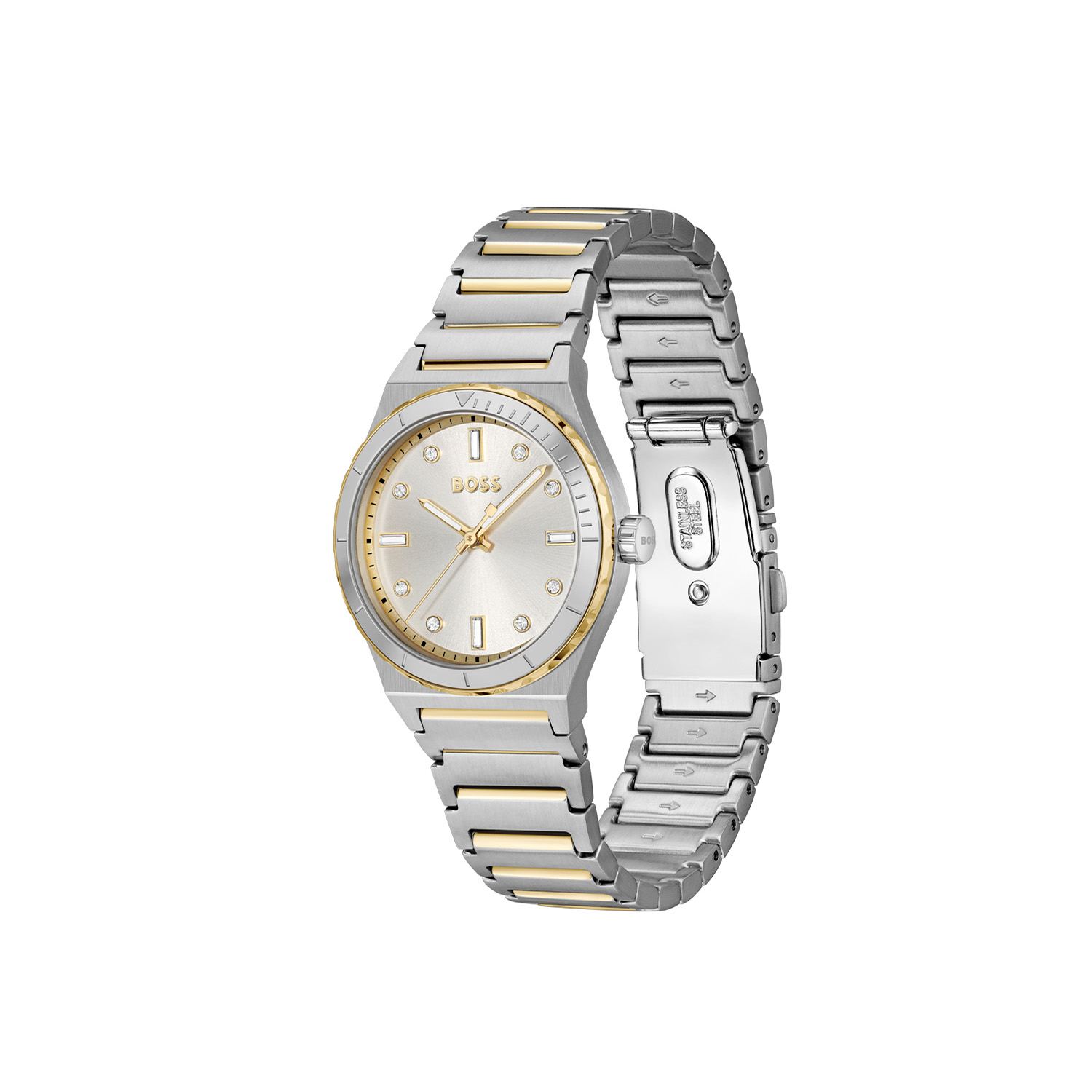 Dit BOSS horloge uit de CANDOR SPORT serie met artikelnr: HB1502790 heeft een chique uitstraling. Zeer geschikt voor de moderne stijlvolle vrouw van nu. Het dameshorloge valt op door zijn stalen horlogekast met een zilverkleurige aluminium bezel en een zilverwitte sunray wijzerplaat met ronde en baquet kristallen als uursaanduiding. De fijne wijzers hebben een lumibrite accent. Aan de kast zit een stalen strak ogende schakelband met een vouwsluiting. Het horloge heeft een doorsnee van 32mm een mineraalglas en is 3ATM.