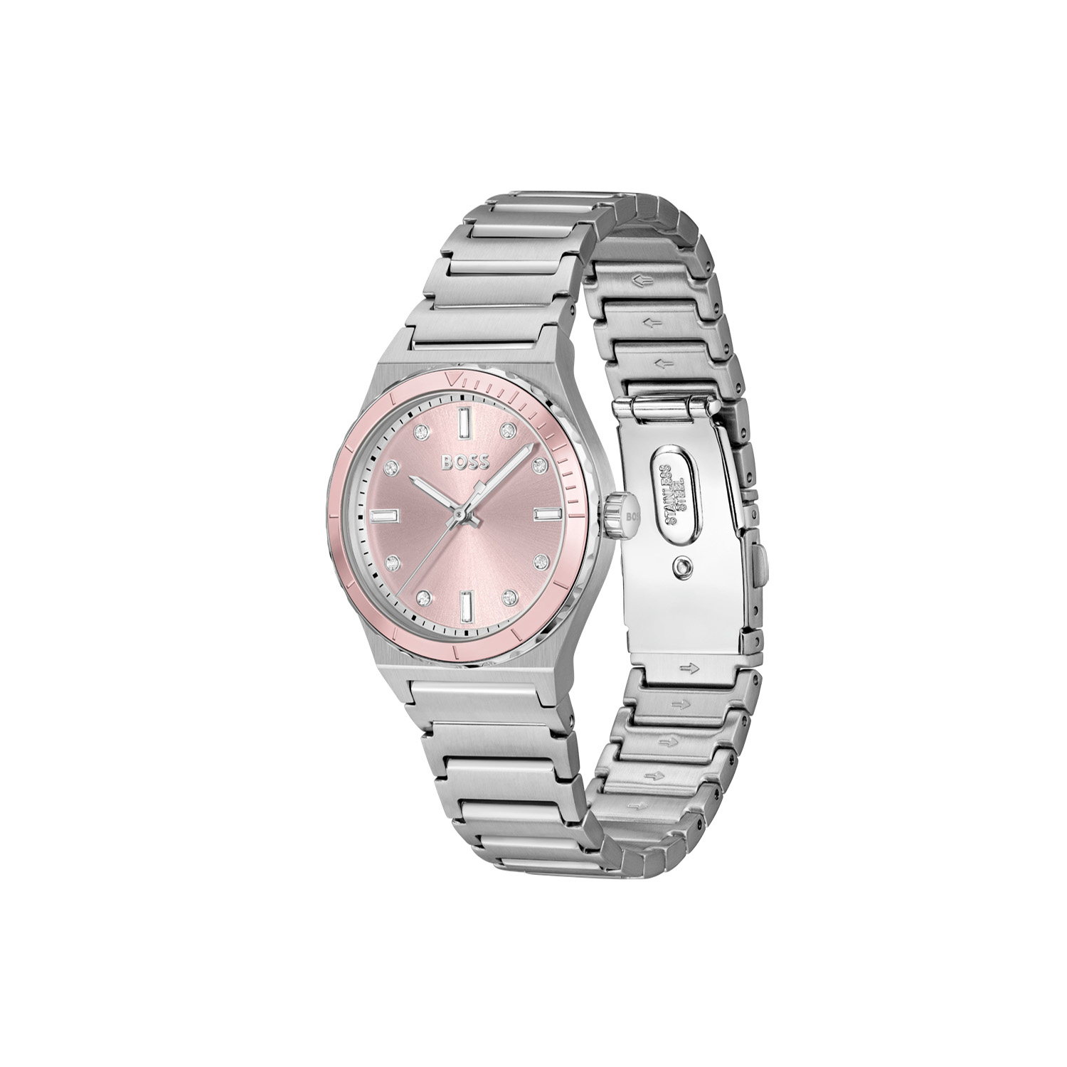Dit BOSS horloge uit de CANDOR SPORT serie met artikelnr: HB1502788 heeft een chique uitstraling. Zeer geschikt voor de moderne stijlvolle vrouw van nu. Het dameshorloge valt op door zijn stalen horlogekast met een roze aluminium bezel en een roze sunray wijzerplaat met ronde en baquet kristallen als uursaanduiding. De fijne wijzers hebben een lumibrite accent. Aan de kast zit een stalen strak ogende schakelband met een vouwsluiting. Het horloge heeft een doorsnee van 32mm een mineraalglas en is 3ATM.