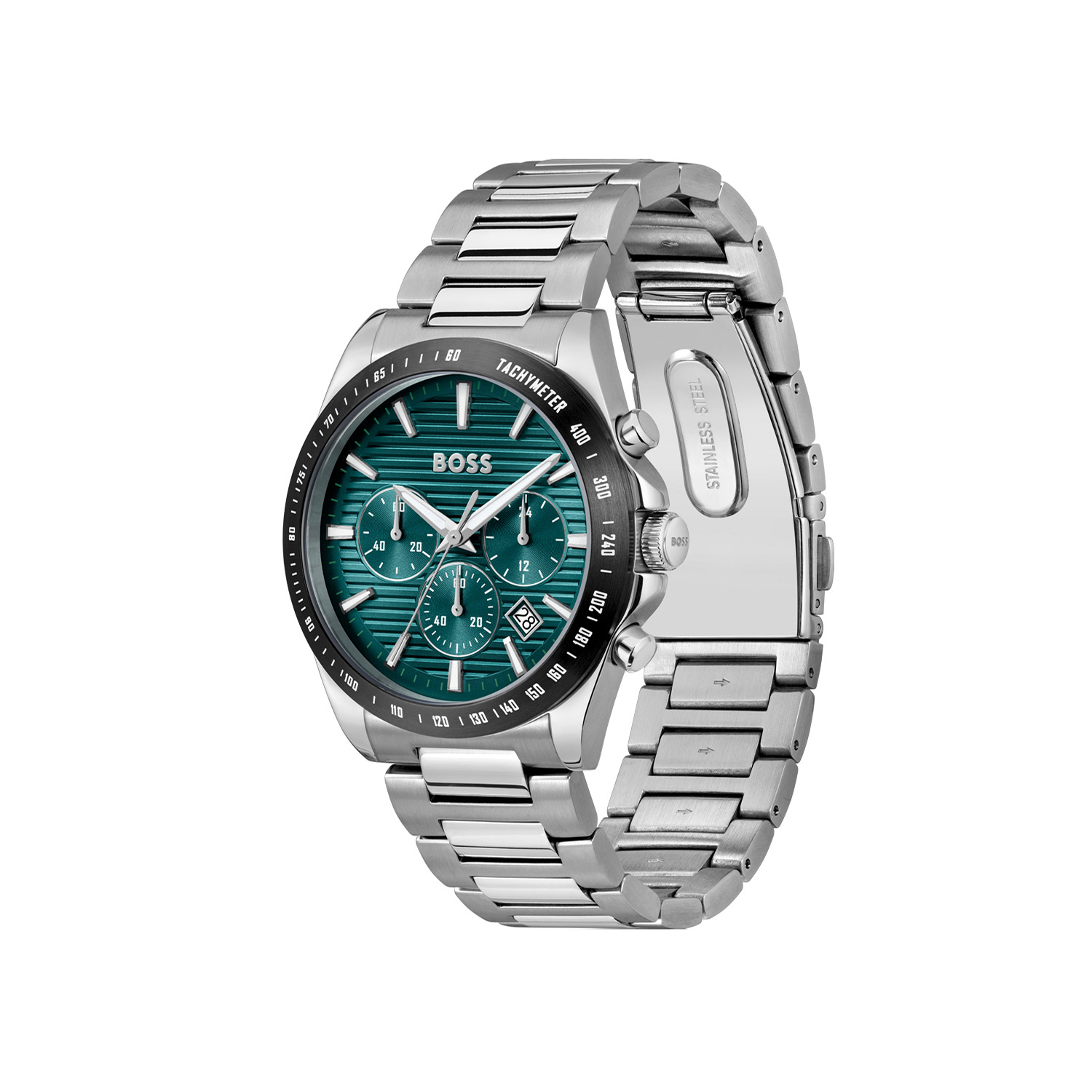 Dit BOSS horloge uit de STRIKE CHRONO serie met artikelnr: HB1514241 heeft een luxe uitstraling. Zeer geschikt voor de moderne stijlvolle man van nu. Het herenhorloge valt op door zijn stalen horlogekast met een zwarte bezel met tachymeter en een groene sunray bewerkte wijzerplaat met een chronograaf en een datum. De wijzers en uurstrepen hebben een fijn lumibrite accent. Aan de kast zit een stalen schakelband met een vouwsluiting. Het horloge heeft een doorsnee van 41mm een mineraalglas en is 5ATM.