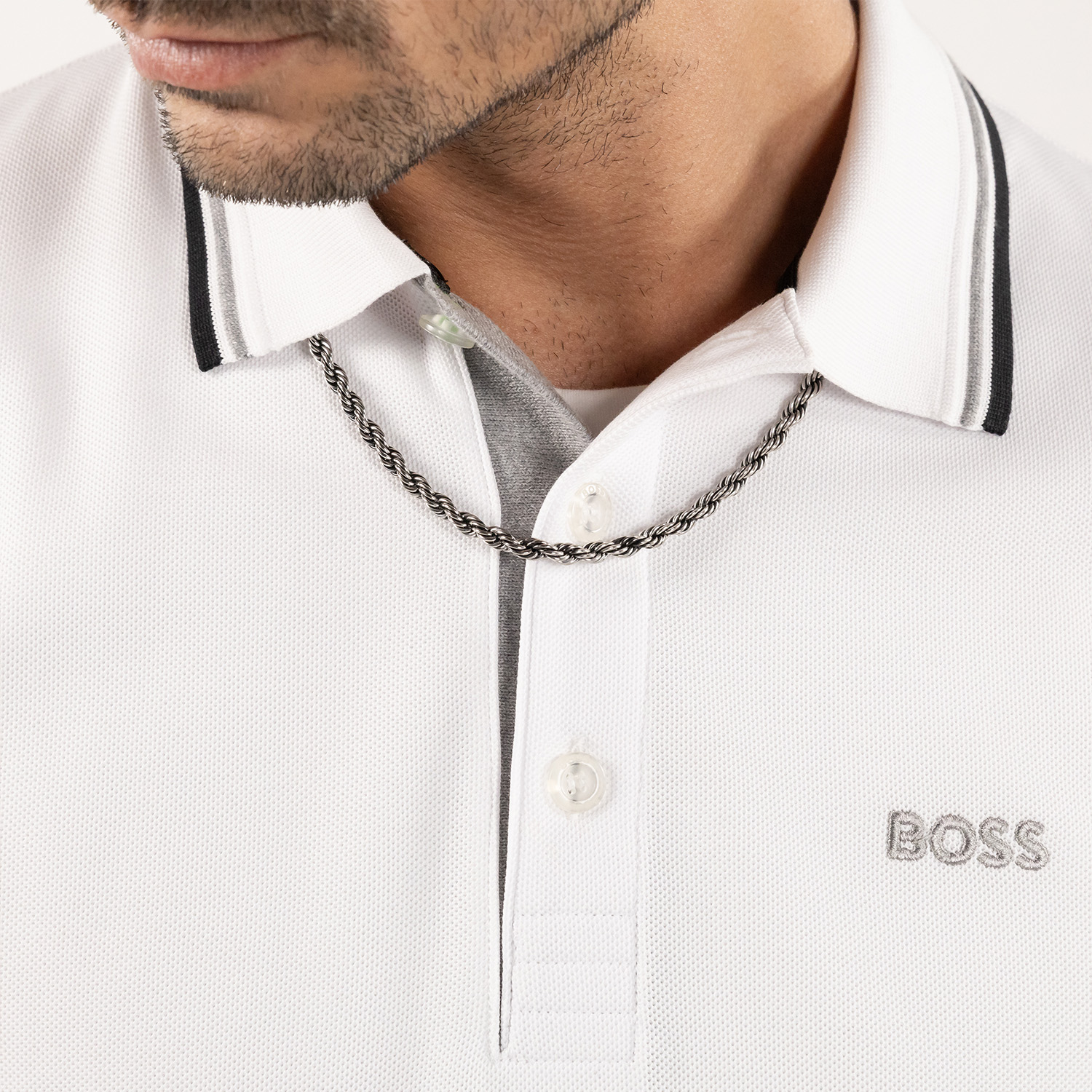 Deze stijlvolle stalen heren schakelketting straalt kracht en elegantie uit. Gemaakt van hoogwaardig roestvrij staal, is de ketting duurzaam, kleurvast en geschikt voor dagelijks gebruik. De zilverkleurige koord ketting van BOSS uit de MYLES ESSENTIALS serie met artikelnr. HBJ1580839 sluit met een karabijnsluiting en heeft een lengte van 55cm. Goed te combineren met de bijpassende sieraden van BOSS.