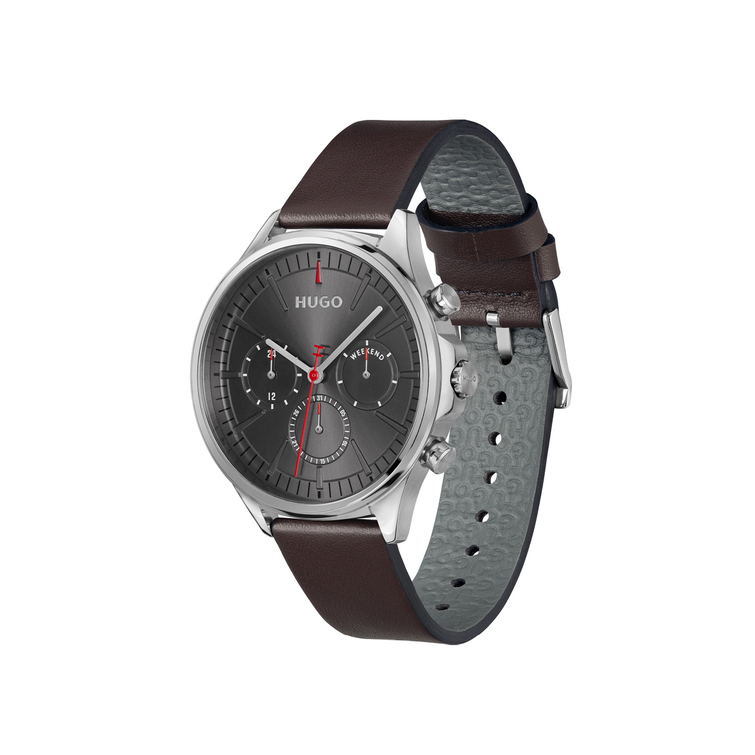 Dit HUGO horloge uit de SMASH MULTI serie met artikelnr. HU1530407 is ontworpen voor de man met durf en die volledig zichzelf is in zijn eigen unieke stijl. Het herenhorloge kenmerkt zich door zijn ronde stalen horlogekast met gladde bezel. Het ontwerp is opvallend vanwege zijn stoere 'kijk mij nou eens' uitstaling en de rode wijzers op de grijze geborstelde wijzerplaat. Het herenhorloge heeft een dag,- datum,- en 24-uursaanduiding. Aan de kast zit een bruine leren horlogeband met een gespsluiting. Het classic ogende herenhorloge heeft een mineraalglas, een doorsnee van 43mm en is 5ATM.