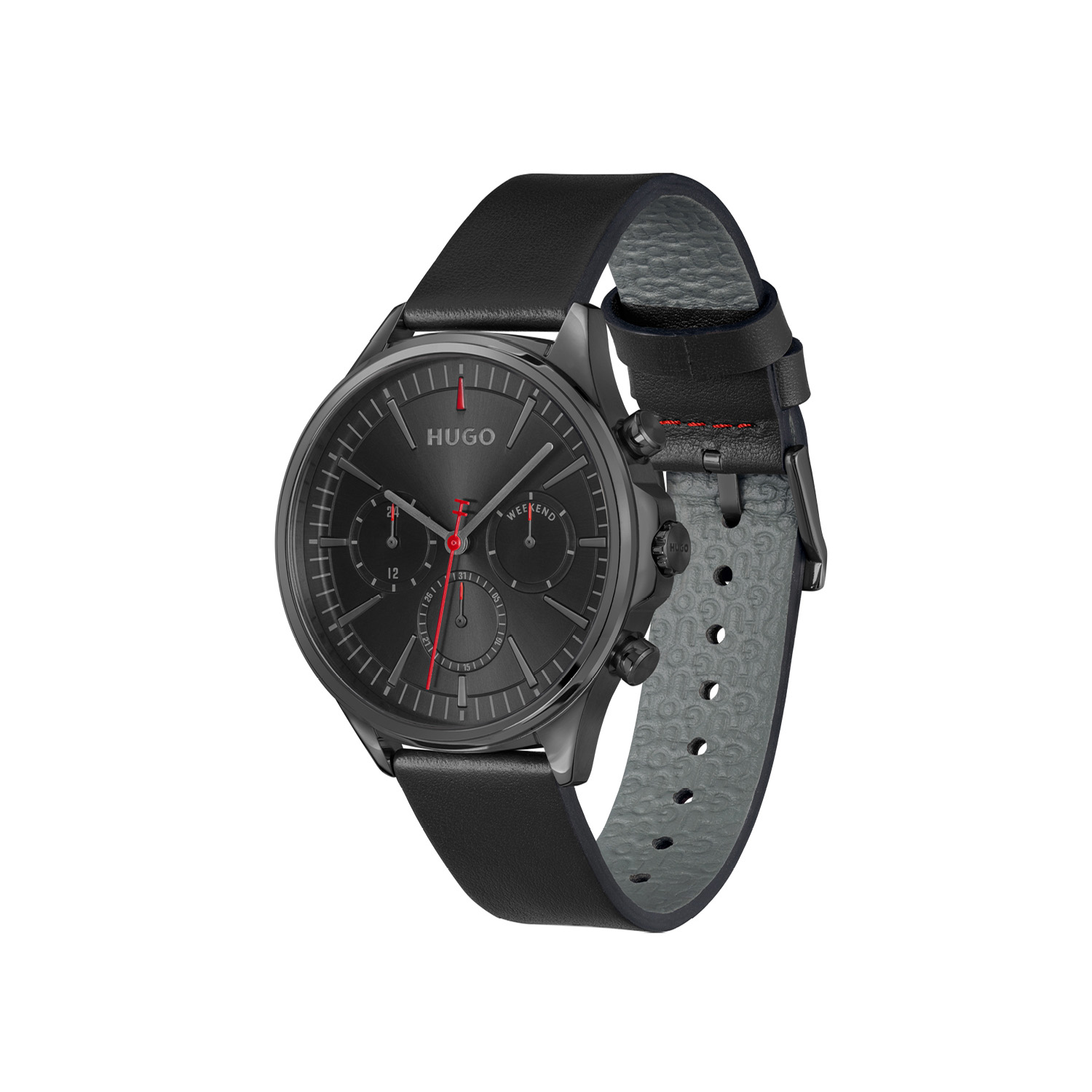 Dit HUGO horloge uit de SMASH MULTI serie met artikelnr. HU1530408 is ontworpen voor de man met durf en die volledig zichzelf is in zijn eigen unieke stijl. Het herenhorloge kenmerkt zich door zijn ronde stalen gunmetal horlogekast met gladde bezel. Het ontwerp is opvallend vanwege zijn stoere 'kijk mij nou eens' uitstaling en de rode wijzers op de zwarte geborstelde wijzerplaat. Het herenhorloge heeft een dag,- datum,- en 24-uursaanduiding. Aan de kast zit een zwarte leren horlogeband met een gespsluiting. Het classic ogende herenhorloge heeft een mineraalglas, een doorsnee van 43mm en is 5ATM.