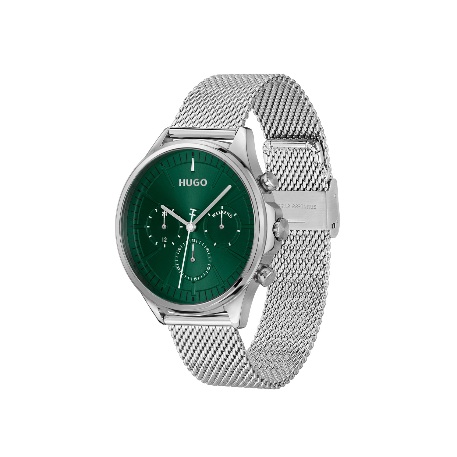 Dit HUGO horloge uit de SMASH MULTI serie met artikelnr. HU1530409 is ontworpen voor de man met durf en die volledig zichzelf is in zijn eigen unieke stijl. Het herenhorloge kenmerkt zich door zijn ronde stalen horlogekast met gladde bezel. Het ontwerp is opvallend vanwege zijn stoere 'kijk mij nou eens' uitstaling en de witte wijzers op de groene geborstelde wijzerplaat. Het herenhorloge heeft een dag,- datum,- en 24-uursaanduiding. Aan de kast zit een zilverkleurige milanese horlogeband met een druksluiting. Het classic ogende herenhorloge heeft een mineraalglas, een doorsnee van 43mm en is 5ATM.
