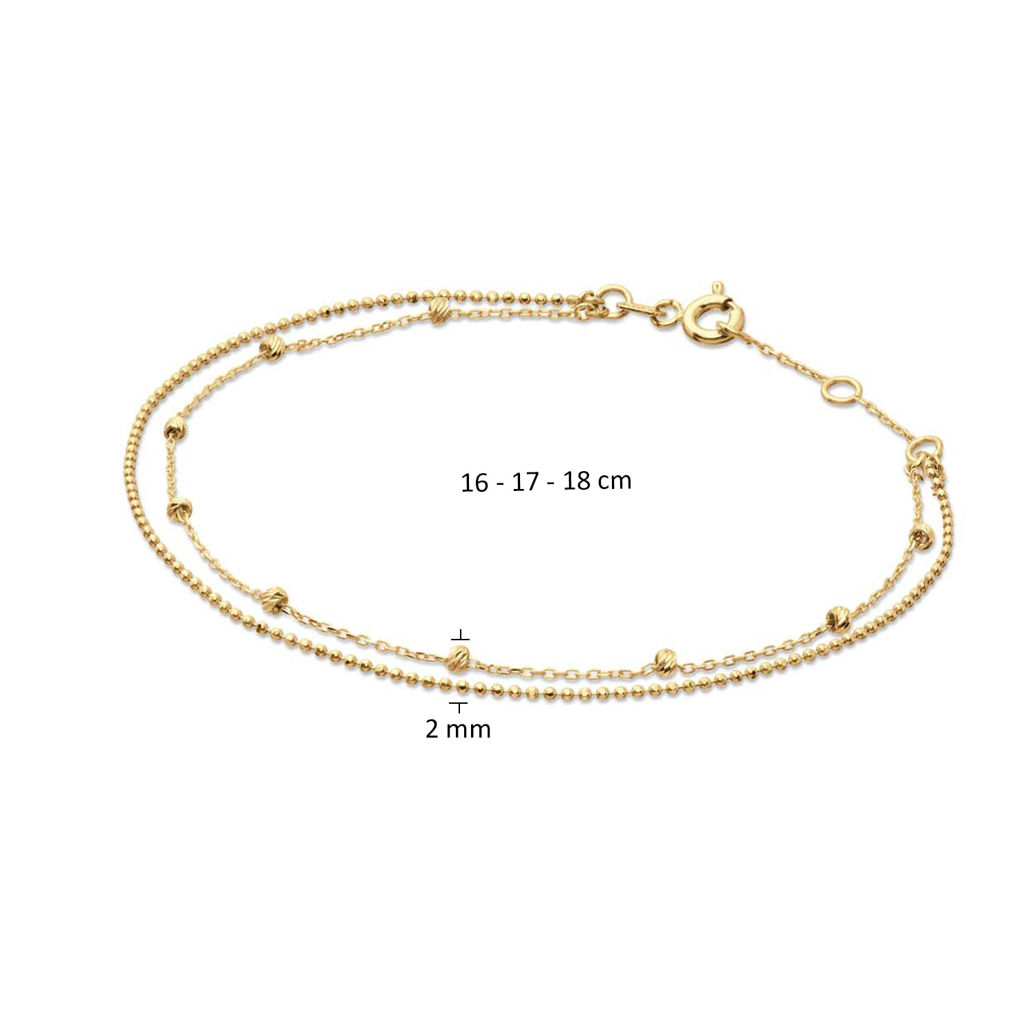 Twee-in-één met deze 14 karaat gouden armband. Deze fijne armband bestaat uit twee banden, 1 band met fijne bolletjes en 1 band met grovere bolletjes. De banden komen samen bij de sluiting.