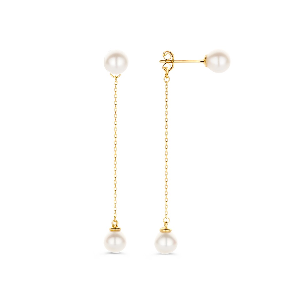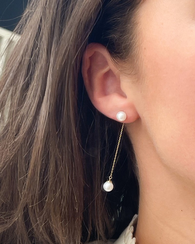 Lange oorbellen met parels. De ene parel valt op de oorlel en de andere hangt op speelse wijze onder het oor.