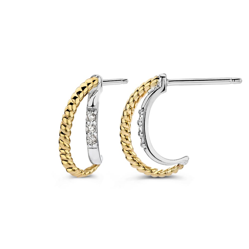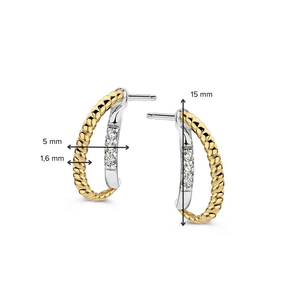 Zilver met goud (geen oplaag) oorstekers. De gouden baan heeft een gedraaide bewerking en in de zilveren baan zijn drie zirkonia's verwerkt.