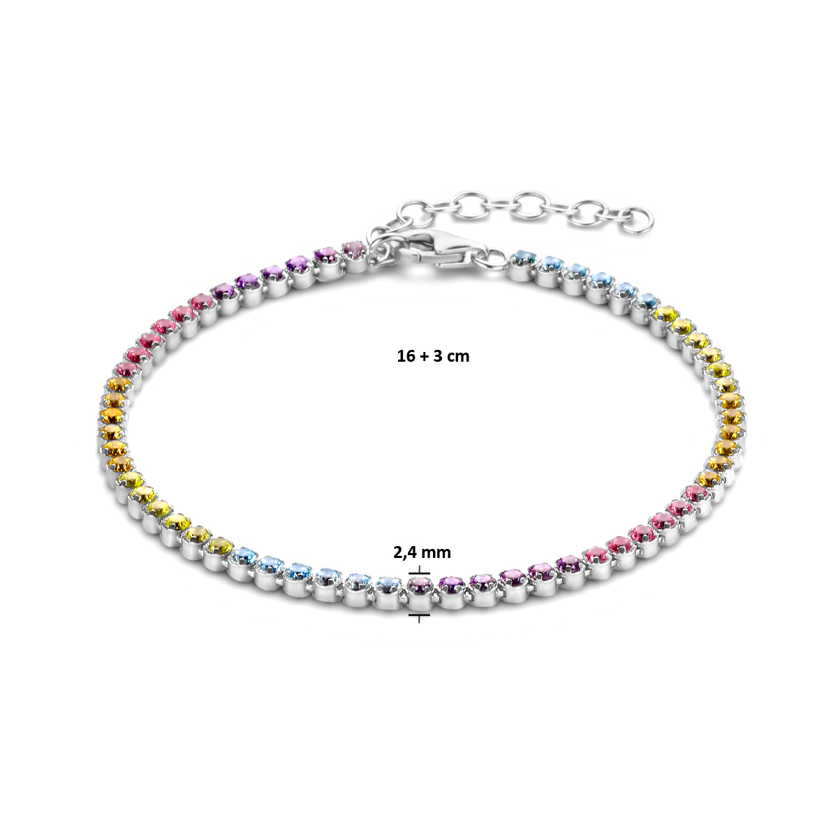 Gerhodineerd 925 zilveren tennisarmband met gekleurd zirkonia. De armband heeft een draaglengte van 16cm en een extensie van 3cm. Uitgevoerd met een karabijn sluiting.