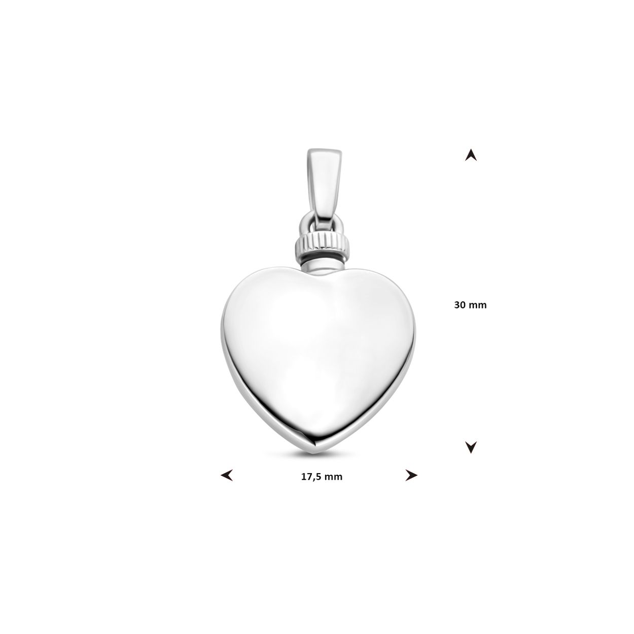 925 Zilveren hartje urnhanger. De urnhanger heeft een totale hoogte van 30mm en een afmeting van 17x17,5mm.