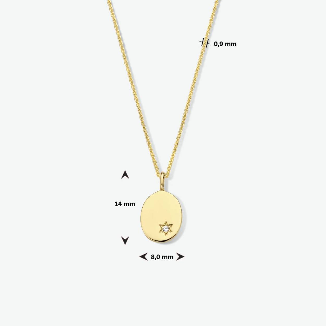 Geelgoud op 925 zilveren collier uitgevoerd met een ovale hanger, zirkonia en een karabijn sluiting. Het collier heeft een draaglengte van 41cm en een extensie van 4cm. Geen garantie op plating.